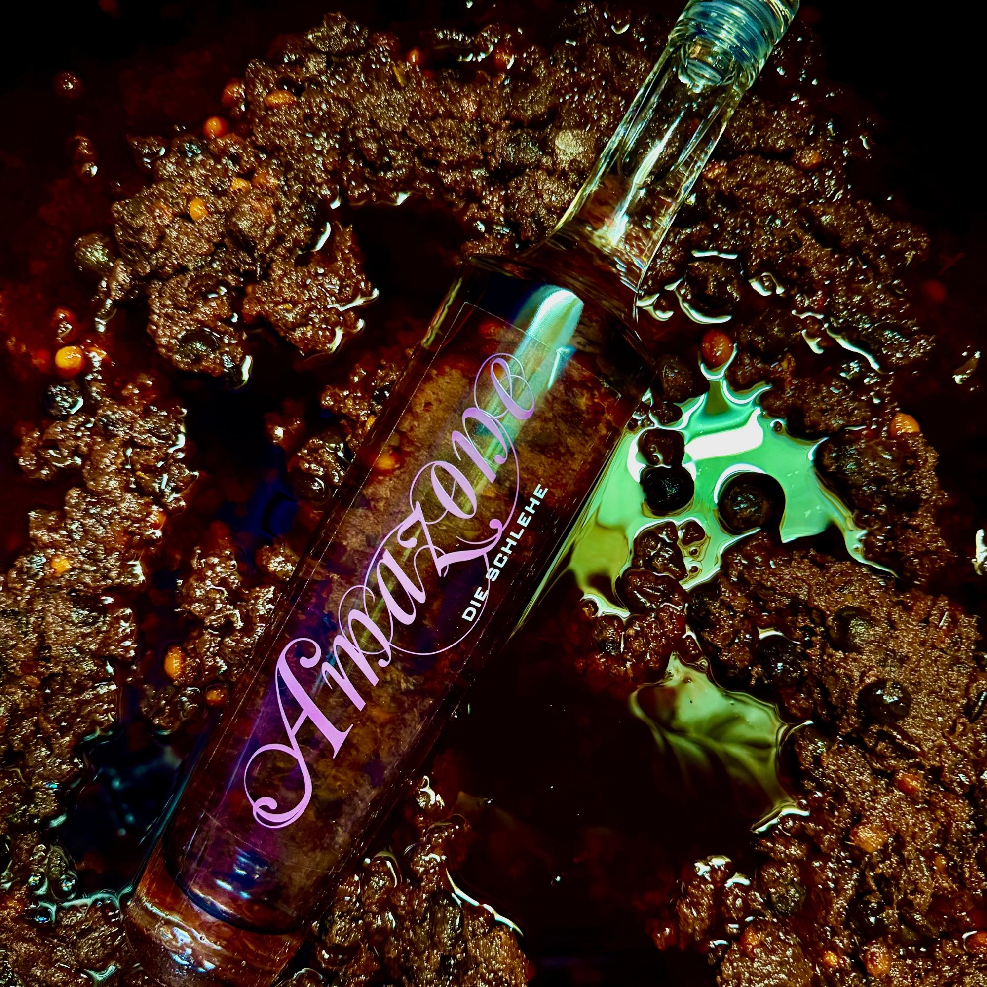 Ihre Heimat ist die Flur, ihre Dornen ihre Verteidigung. Die Schlehe ist ein stolzes Steinobst, das nur in der tiefsten Eiseskälte auch einmal etwas Süße zulässt. Im Glas zeigt Amazone uns ihr bewundernswertes Innerstes: Beerensträucher, Getreidefelder und moosige Wälder – die vielen Facetten ihres Landes vereinen sich in ihrem marzipanigen Charakter.